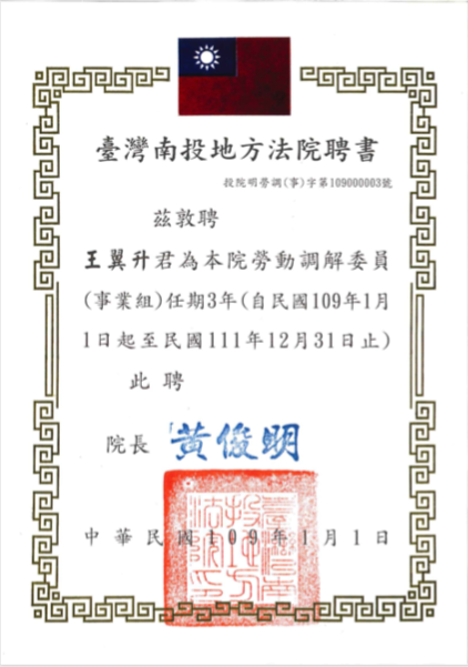 本所王翼升律師獲聘「臺灣南投地方法院勞動調解委員」
