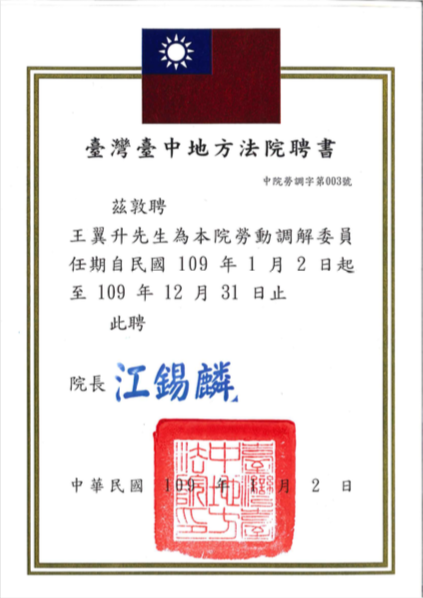 本所王翼升律師獲聘「臺灣臺中地方法院勞動調解委員」