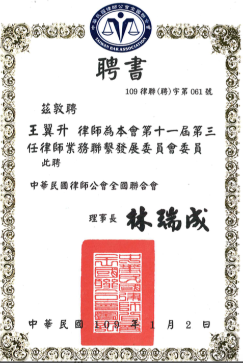 本所王翼升律師獲聘「中華民國律師公會全國聯合會律師業務聯繫發展委員會委員」